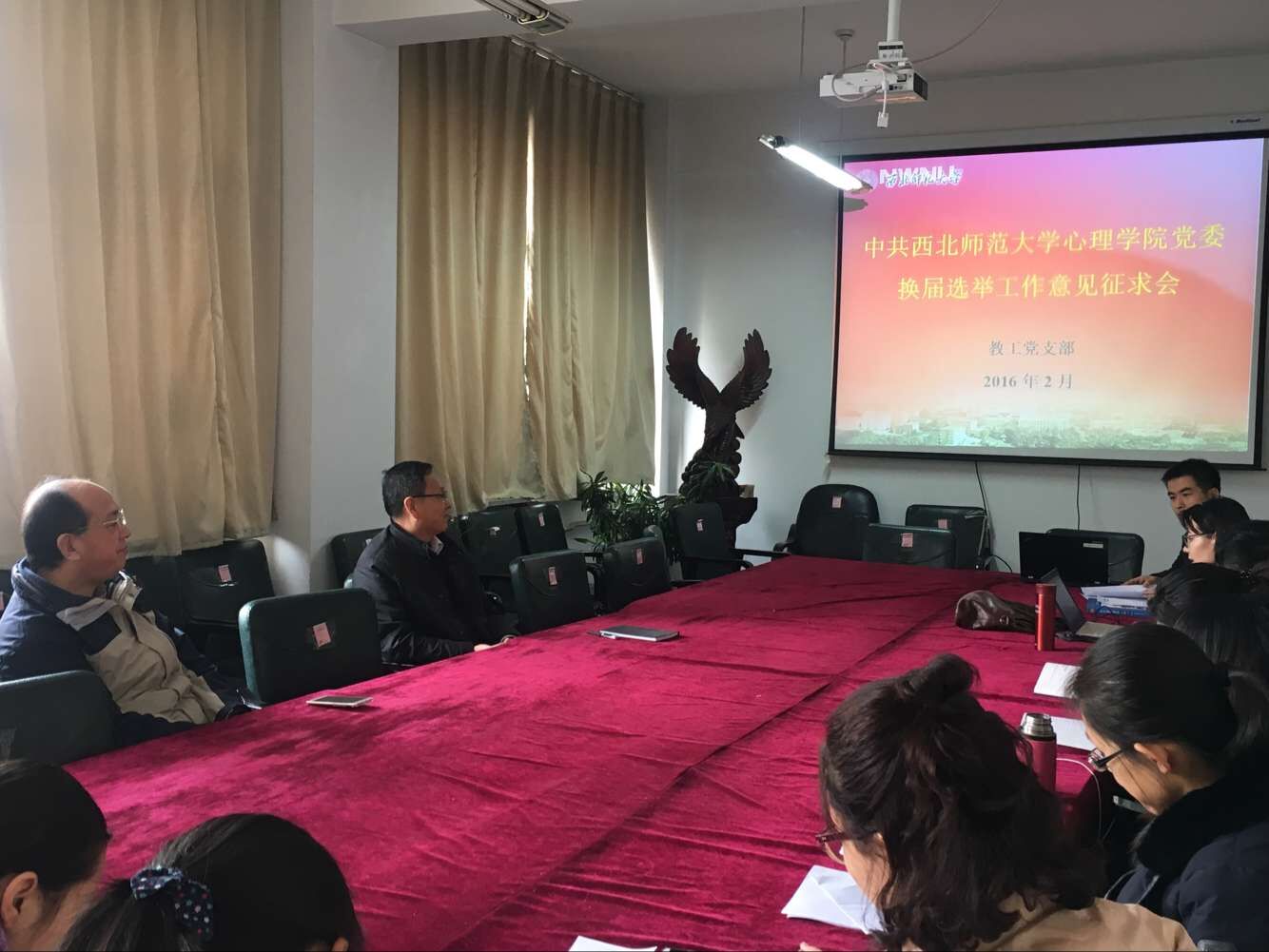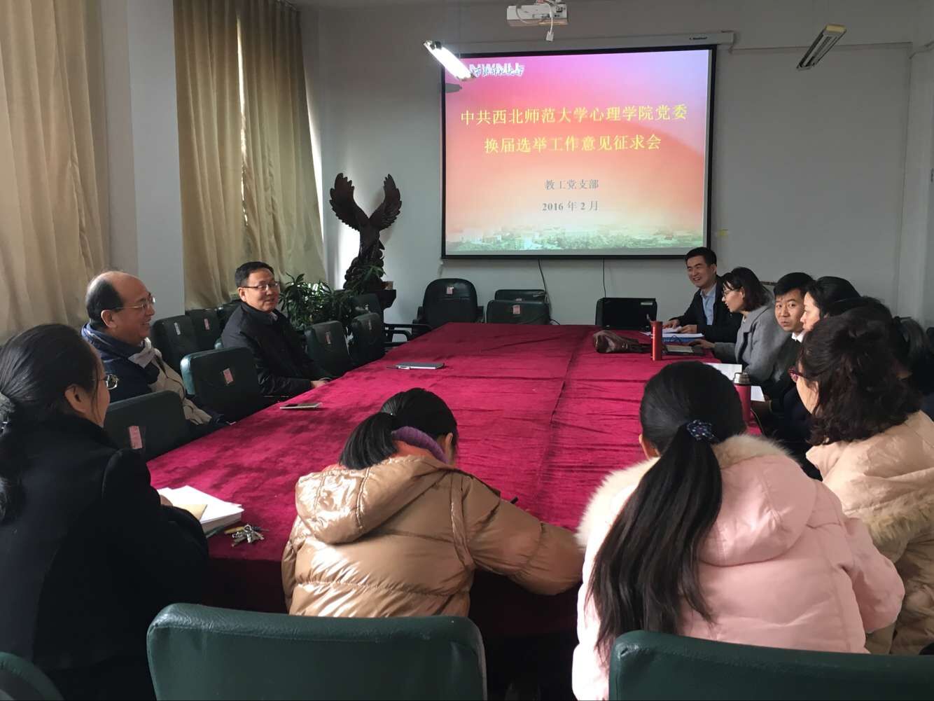 2月23日下午在308会议室,教职工党支部召开讨论会,广泛征求教师党员关于学院党委换届选举的意见和建议。学院院长周爱保教授、党委书记刘慧阳及全体教师党员出席了会议。会议由教职工党支部书记李建升博士主持。