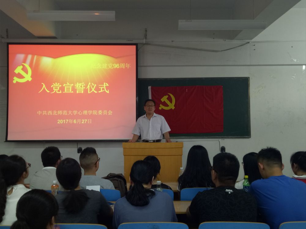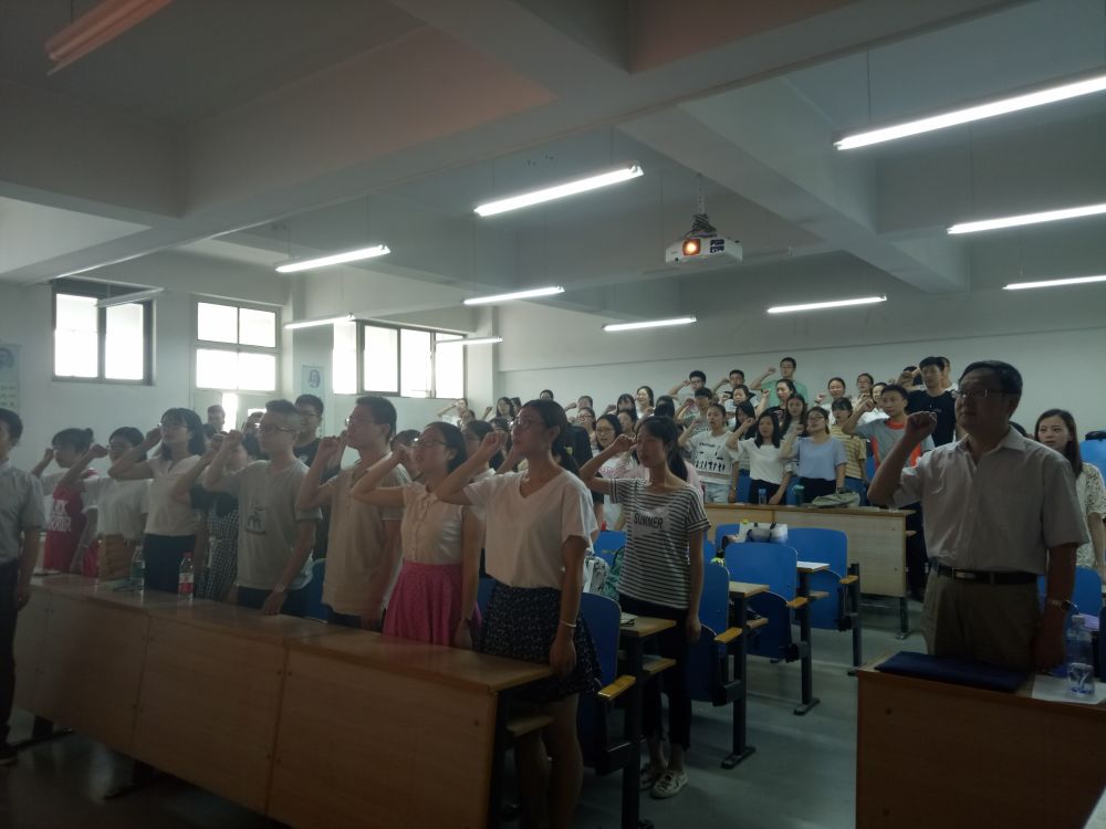 6月27日下午,tyc8722太阳集团城研究生、本科生党支部开展“庆祝建党96周年”主题党日活动,举办了新党员入党宣誓仪式、老党员重温入党誓词和省十三次党代会精神宣讲会。党委书记刘慧阳、党委组织员蒋玲和教师党员代表赵国军以及研究生、本科生党支部90余名党员出席活动。