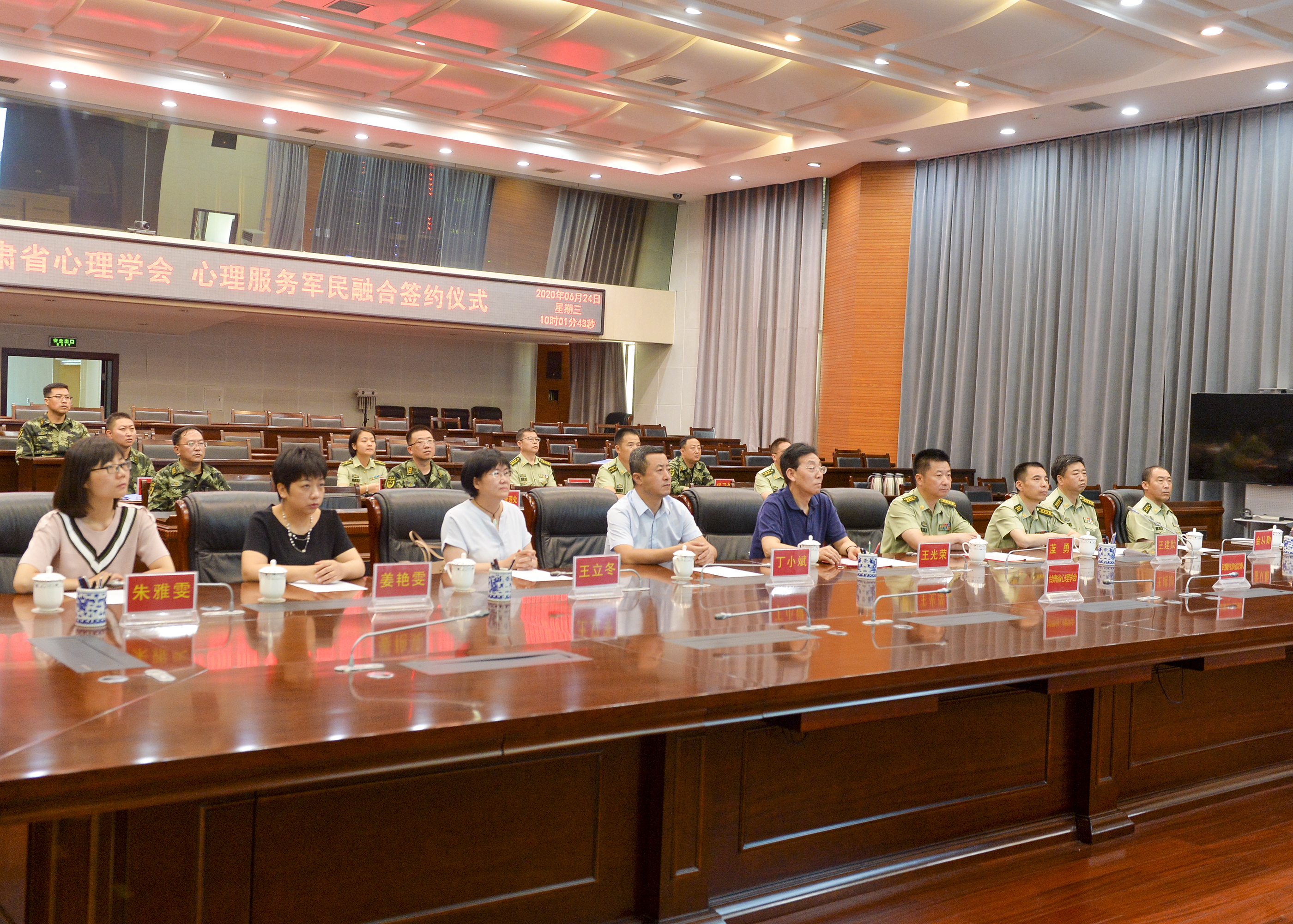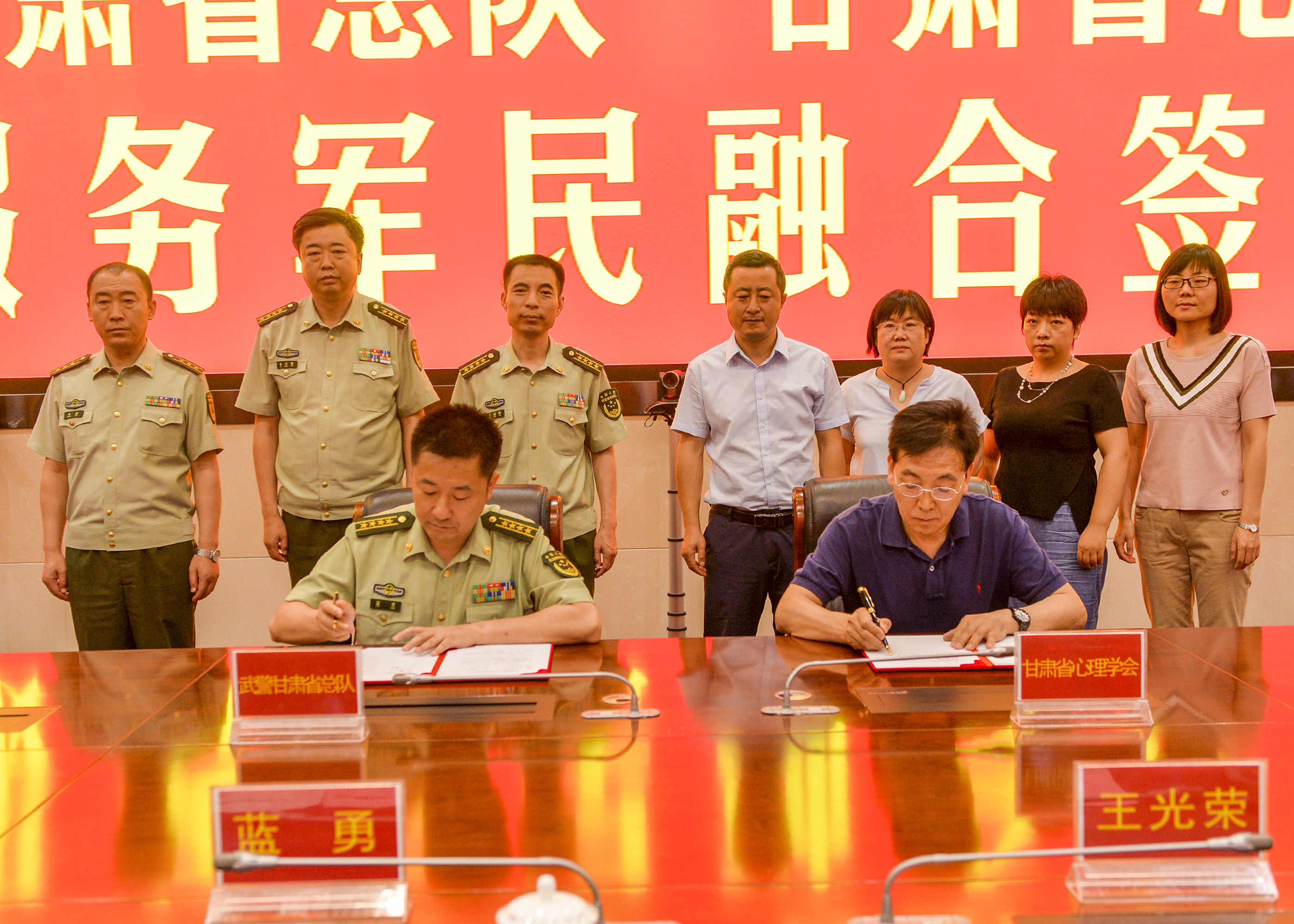 为践行心理学专业服务社会的使命,有力推进心理服务军民融合工作,6月24日上午,武警甘肃省总队与甘肃省心理学会和tyc8722太阳集团城在总队机关举行心理服务军民融合签约仪式。仪式由总队政治工作部王建勋主任主持,总队蓝勇副政委和省心理学会王光荣秘书长,分别代表总队和省心理学会致辞并签署协议。tyc8722太阳集团城丁小斌副院长、姜艳斐、朱雅雯老师、省心理学会常务理事王立冬和总队心理工作领导小组成员参加签约仪式。