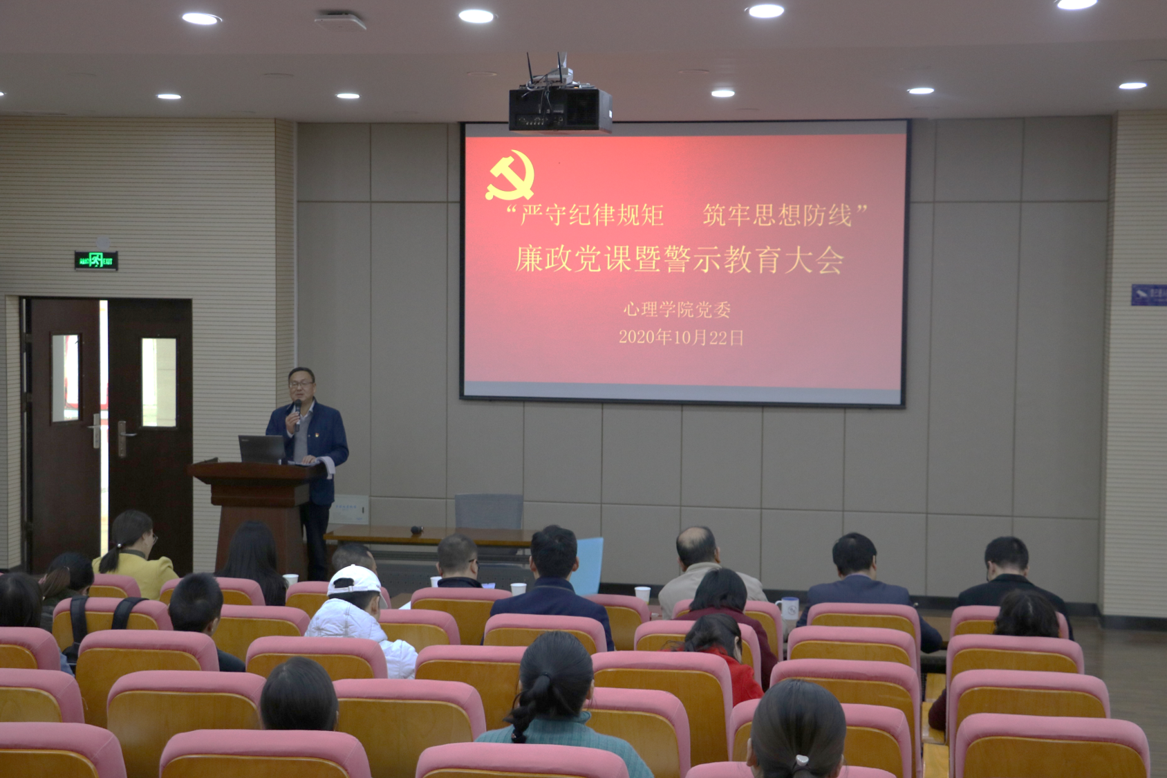 2020年10月22日下午,tyc8722太阳集团城党委在新校区特教楼召开“严守纪律规矩,筑牢思想防线”廉政党课暨警示教育大会,全体教职工和学生党员参加会议。院党委书记刘慧阳主持会议。