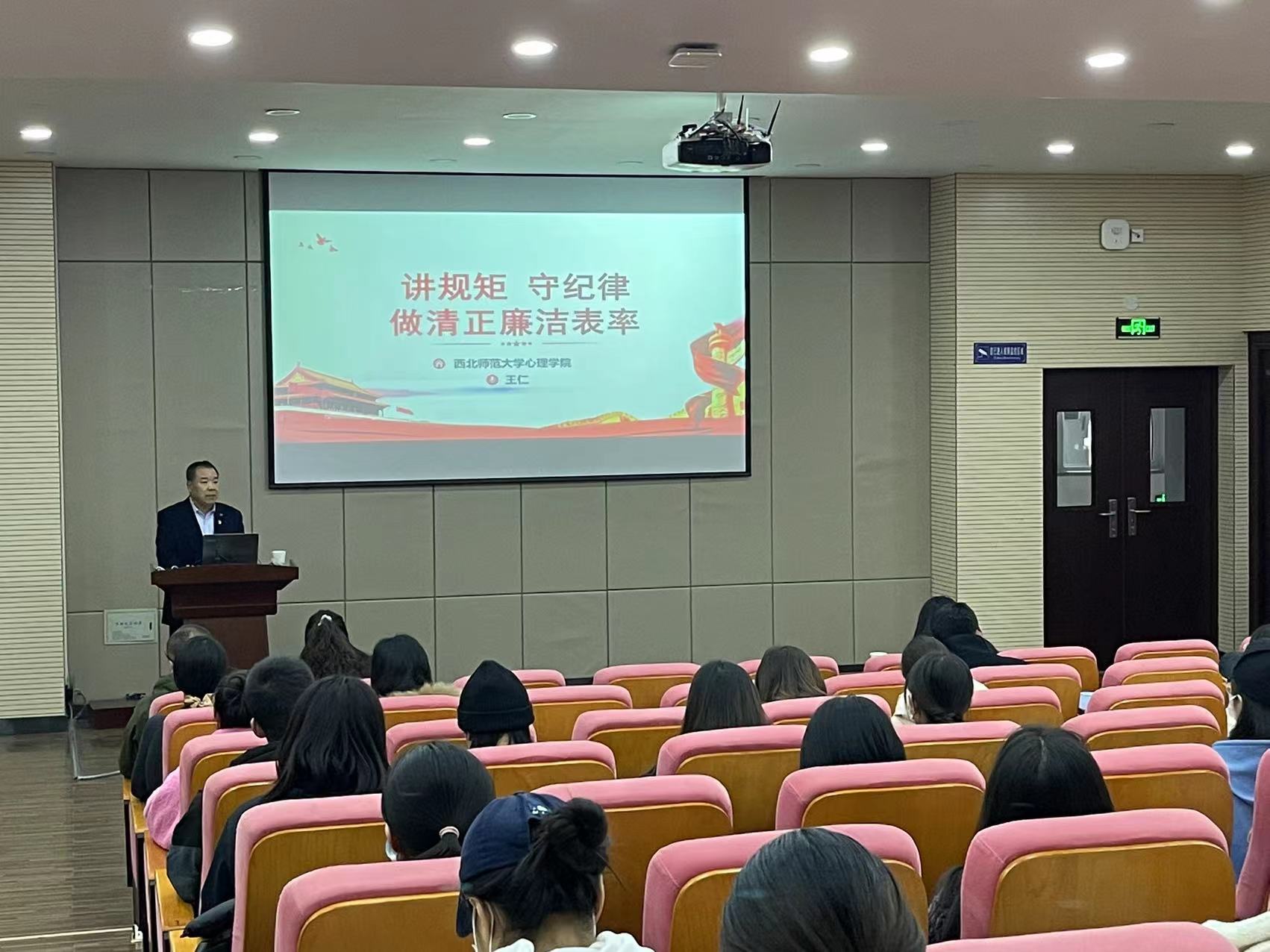 院党委书记王仁同志作了题为《讲规矩守纪律 做清正廉洁表率》的廉政党课。王仁同志从“坚定理想信念,牢记初心使命”、“严守纪律底线,做到廉洁从业”两个方面作了重点论述。他深刻解读了党的理想信念、党的纪律和从严治党的丰富内涵,以生动的语言,结合典型事例和案件论述了坚定理想信念、遵守党纪党规的重要性,号召全体师生党员要认真学习习近平新时代中国特色社会主义思想,坚定理想信念,坚守行为底线,以德立身,以德立学,廉洁从业,为实现中华民族伟大复兴贡献力量。