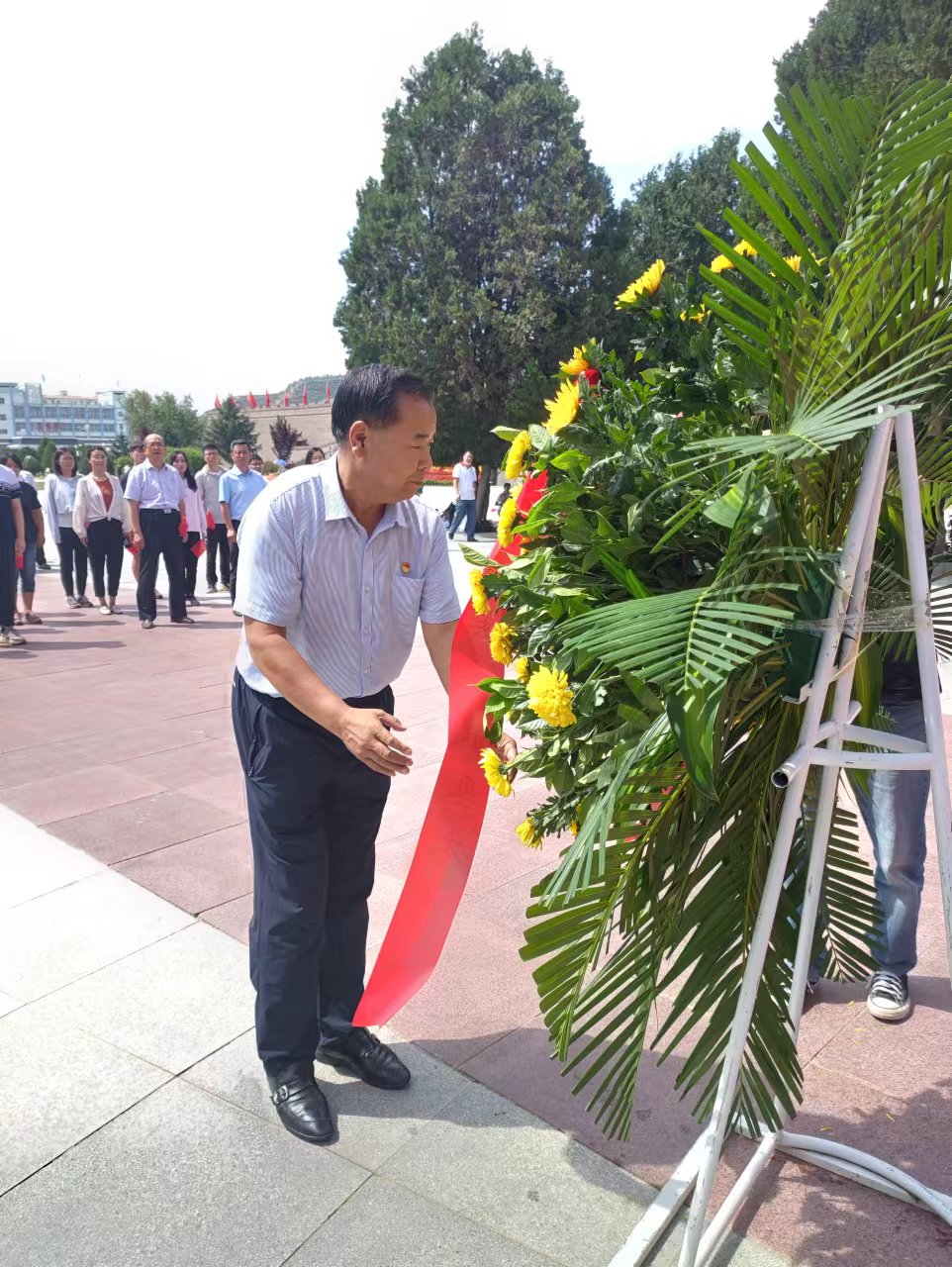 早晨,全体老师乘坐大巴车从太阳集团tcy8722出发,于上午10点半左右到达会宁红军会师旧址。全体党员教师在中国工农红军第一二四方面军会师纪念塔前肃立,学院党委书记王仁同志代表全体党员教师敬献花篮。全体党员教师向红军英烈鞠躬致敬,并在王仁书记带领下重温入党誓词。每位党员教师的坚毅神情都体现了对党的无限忠诚。