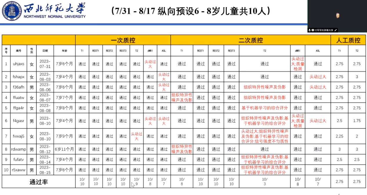 儿童磁共振数据的采集概况。之后,针对各个不同序列和预试期间水模质控结果进行了详细汇报,并对导致未通过数据的可能原因进行了分析。最后,尹玉龙老师对扫描过程中存在的问题和困难进行了反馈。
