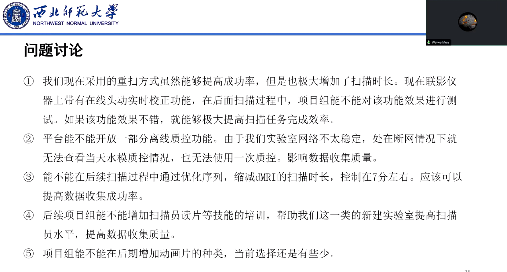 会议从预试情况概览、序列及水模质控详情、问题讨论三个方面进行。会议开始后,首先由付军军老师整体汇报了预试期间10