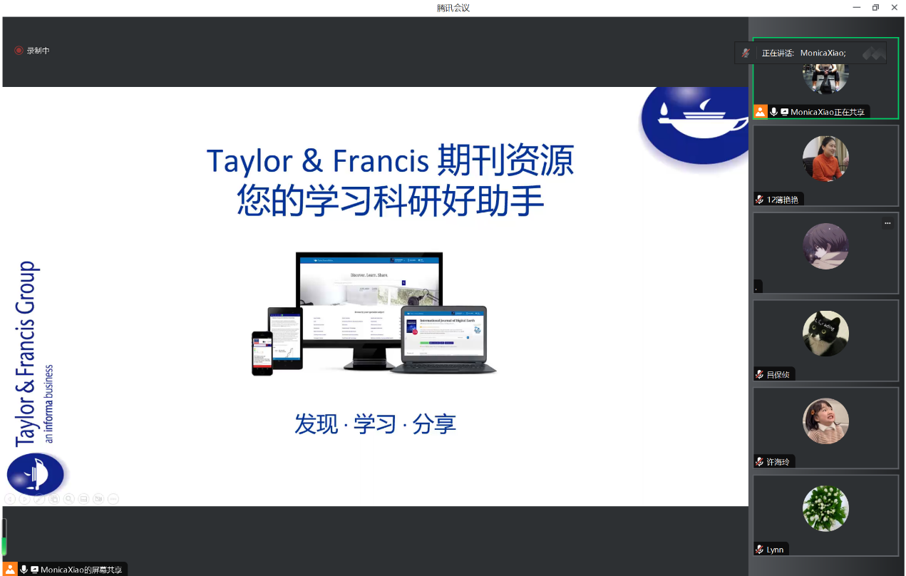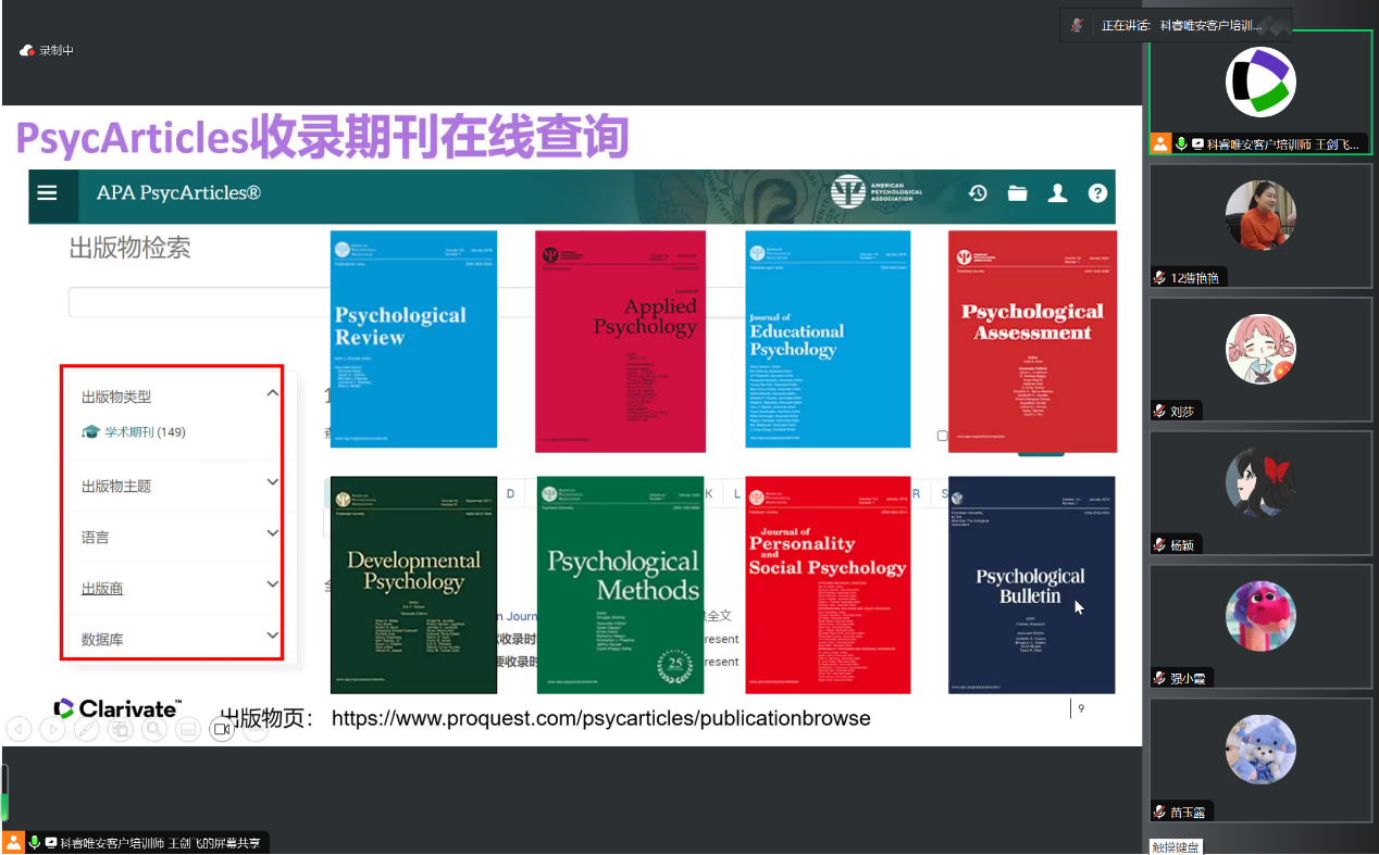 肖苒苒老师重点讲解了Taylor & Francis出版集团及心理学期刊介绍、Taylor & Francis Online平台功能和平台检索技巧三个方面的内容。期间,肖苒苒老师就平台提供的按照期刊浏览、学科浏览、快速检索和高级检索等文献查询方式分别进行了演示指导,提供了很多实用的检索技巧,并且以有奖问答的游戏形式与同学们进行了互动。