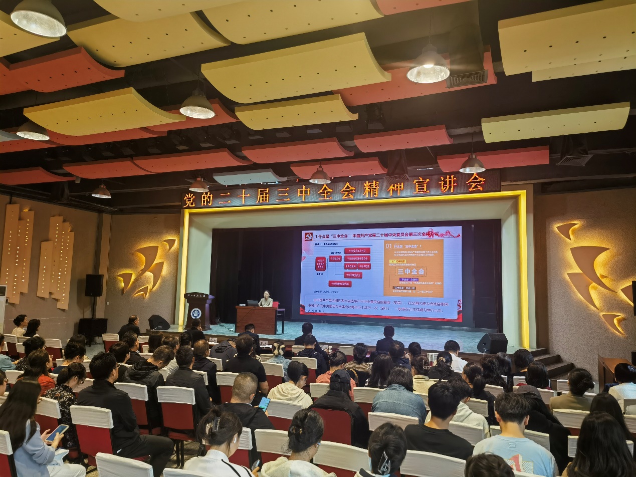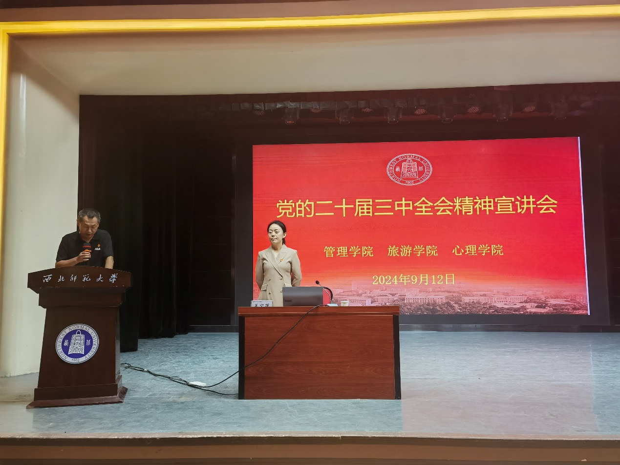 9月12日下午,管理学院党委、旅游学院党委、tyc8722太阳集团城党委联合召开党的二十届三中全会精神宣讲报告会,会议邀请马克思主义学院姜宝莲副教授作题为《聚焦发展全过程人民民主 为中国式现代化凝心聚力》的专题辅导报告,三个学院师生共计300余人在大学生活动中心二楼报告厅参加宣讲会。会议由tyc8722太阳集团城党委书记杨杰主持。