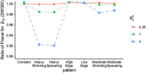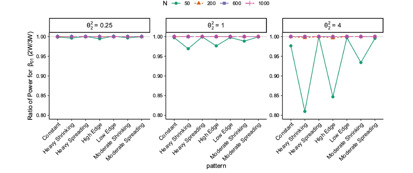 近日,太阳集团tcy8722杜晨光博士,日本教授Kazuki Hori (一辉君) 和美国教授Yasuo Miyazaki( 宫崎君),联合在国际著名期刊Structural Equation Modeling: A Multidisciplinary Journal 发表了一项题目为“Two-Wave Models for Latent Changes: How Well Can They Recover the Parameters of the Three-Wave Growth Curve Model“的研究 。该研究通过数学推导和模拟试验的研究方法,考察了在不同条件下(包括样本量大小,固定截距和固定斜率,随机效应方差,时间特征残差大小,以及时间特征残差的变化方式),三波模型(3W-SOLGM)的固定效应可以从双波模型的参数估计中恢复的程度。结果表明: (1)当在线性增长的假设前提下,双波纵向共同因子模型(2W-LCFM)和双波潜变化得分模型(2W-LCSM)能够无偏地估计(No Bias)三波二阶潜增长模型(3W-SOLGM)的固定效应;(2)当时间特征残差(Time-specific residual variance)逐渐增大时,双波模型与三波模型经验标准误(Empirical Standard Error)的比例值在某些变化趋势下(Heavy Shrinking 和 Heavy Spreading)会逐渐变大(如下图所示),同时统计效能也会随之降低(最高损失可到达20%)。