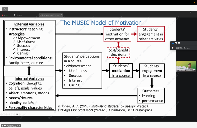 Jones教授系统介绍了MUSIC动机模型的五个核心要素——自主权、有用性、成功感、兴趣和关怀,并结合教学案例说明其应用方法。随后,他分析了教师策略、环境因素及学生个体特征等内外部变量如何通过课程感知和参与度影响学习表现,并强调MUSIC模型对设计激励性教学策略的指导价值。最后,他建议未来研究进一步探索该模型的差异化应用场景。