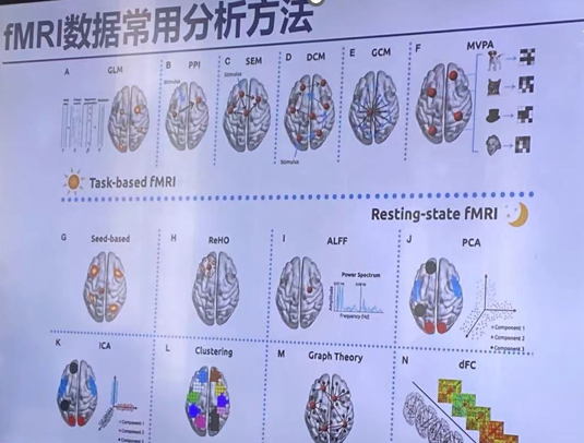 王老师首先介绍了fMRI数据分析中BLOD和HRF的相关基础知识,并进一步详细的介绍了HRF的特征。其次,王老师讲解了fMRI中常用的实验设计方法block design、slow ER design、rapid jittered ER design、mixed design。王老师还介绍了fMRI任务态(如GLM、PPI、SEM和DCM等)和静息态(Seed-based、reHO、ALFF和PCA等)数据分析方法。