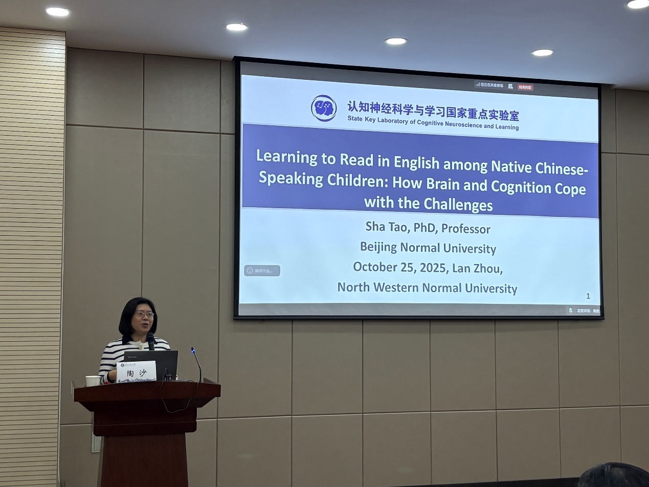 10月25日上午,甘肃省行为与心理健康重点实验室第三届学术委员会第一次会议在太阳集团tcy8722知行校区举行。北京师范大学陶沙教授应邀于当日上午9:30在特教楼159报告厅作了题为“以英语为第二语言的中国儿童英语阅读学习:大脑和认知如何应对挑战”的学术报告。