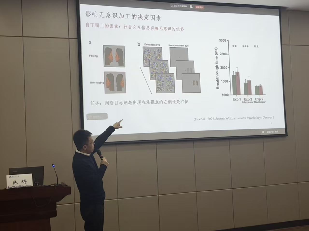 陈教授重点介绍了团队运用连续闪烁抑制范式的创新发现。在自下而上的影响因素方面,研究团队发现社会交互信息在无意识加工中具有突破优势,且这种优势源于高级社会信息的整合效应,而非低级物理线索。通过一系列实验验证,面对面的社会交互信息能够更快突破无意识抑制进入意识。在自上而下的影响因素方面,研究揭示工作记忆可以促进无意识加工,但这种促进作用仅限于基本特征,对细节特征无效,揭示了无意识加工在精细信息处理上的局限性。