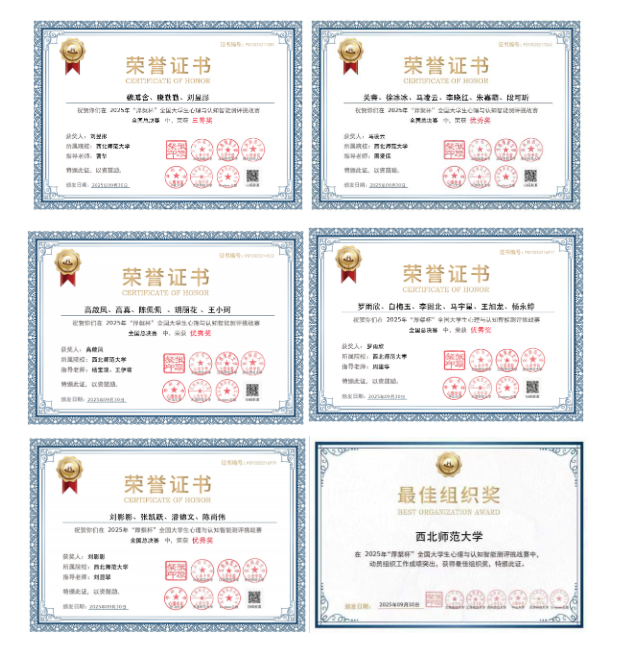 在本届比赛中,tyc8722太阳集团城多支队伍凭借扎实的专业基础、出色的创新能力和稳定的现场发挥,在全国总决赛中表现优异,其中“gogogo出发咯队”荣获全国总决赛三等奖,“周三小队”“智心筑梦队”“灵犀调研队”“超能陆战队”四支队伍荣获全国总决赛优秀奖,充分展现了我校在心理学与认知智能交叉领域的育人实效。此外,我校因在赛事组织、学生动员与指导支持等方面的突出贡献,被大赛组委会授予“优秀组织奖”,体现了学校在跨学科竞赛组织与创新人才培养方面的扎实工作与良好生态。